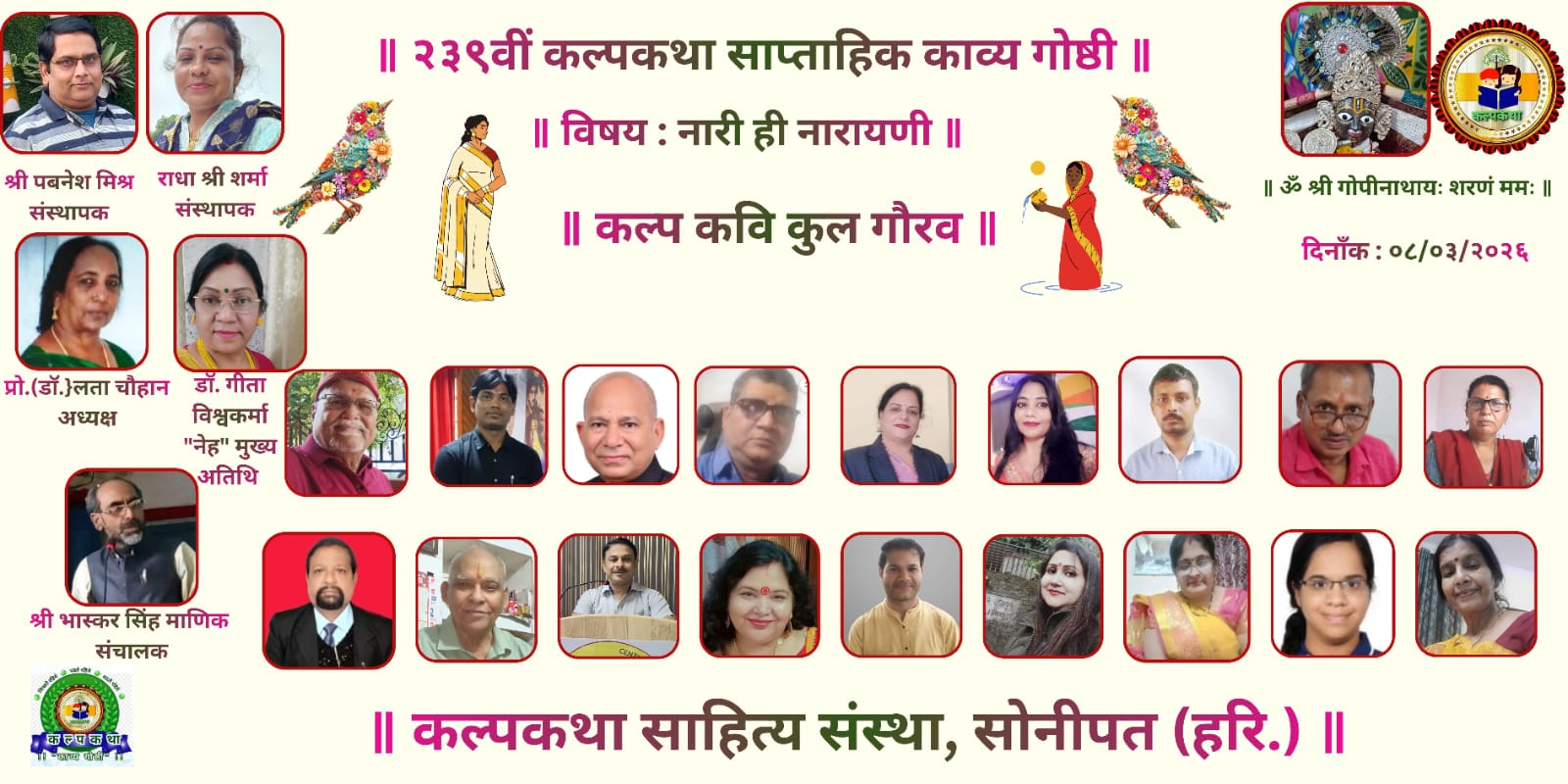 कल्पकथा साहित्य संस्था परिवार द्वारा आयोजित २३९वीं साप्ताहिक आभासी काव्य गोष्ठी ‘अंतर्राष्ट्रीय महिला दिवस’ के पावन अवसर पर ‘नारी ही नारायणी’ विषय पर अत्यंत साहित्यिक वातावरण में कराई गई। बलौदा से विदुषी साहित्यकार डॉ. गीता विश्वकर्मा मुख्य अतिथि रहीं।