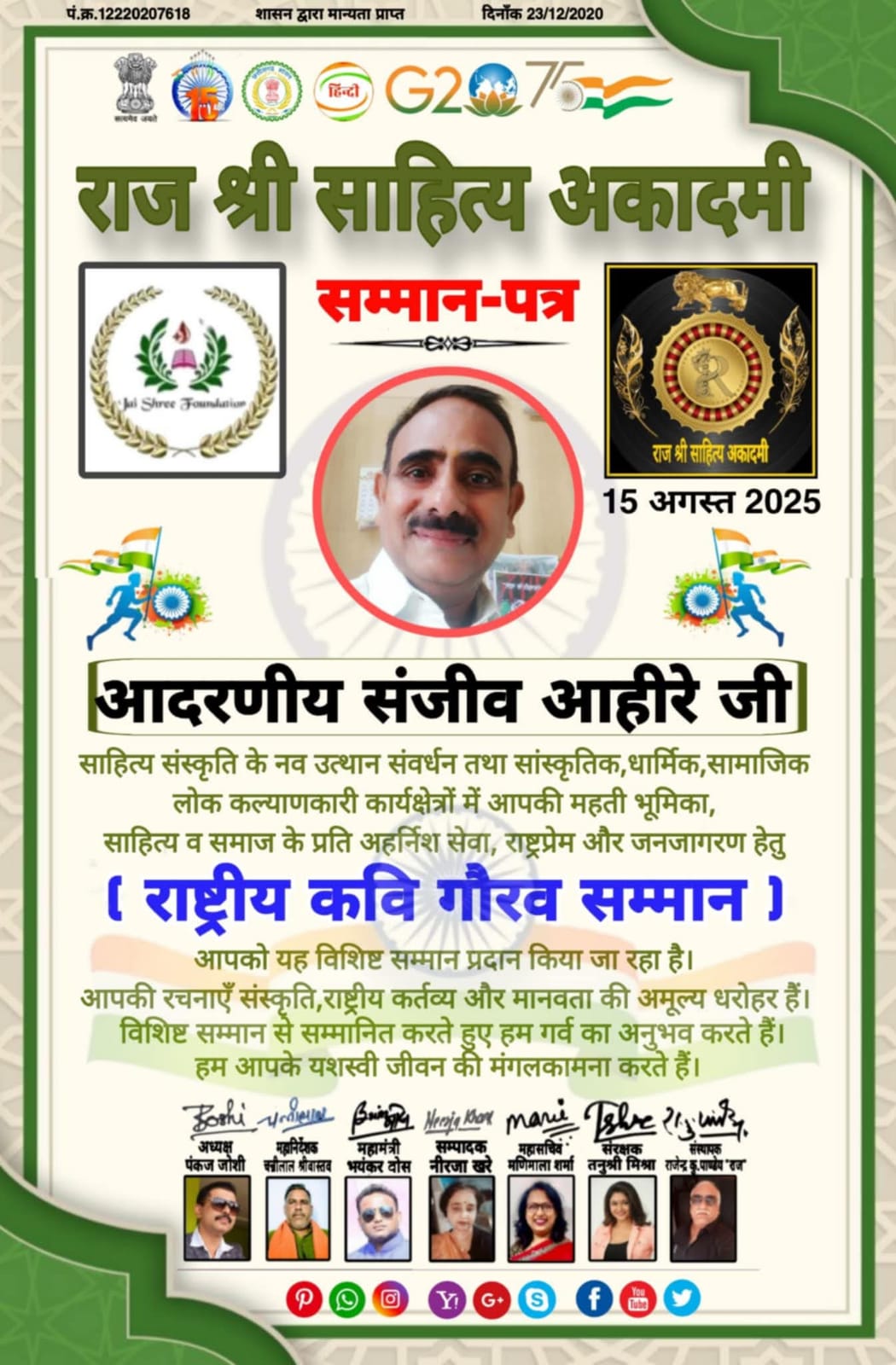 राजश्री साहित्य अकादमी द्वारा इस वर्ष भी १५ अगस्त के राष्ट्रीय अवसर पर देश के चुनिंदा साहित्यकारों को उनकी रचनाधर्मिता हेतु सम्मानित किया गया। इस कड़ी में लेखक संजीव आहिरे (नासिक) को राष्ट्रीय सम्मान से नवाजा गया। आपने सम्मान हेतु अकादमी के प्रति कृतज्ञता ज्ञापित की है।