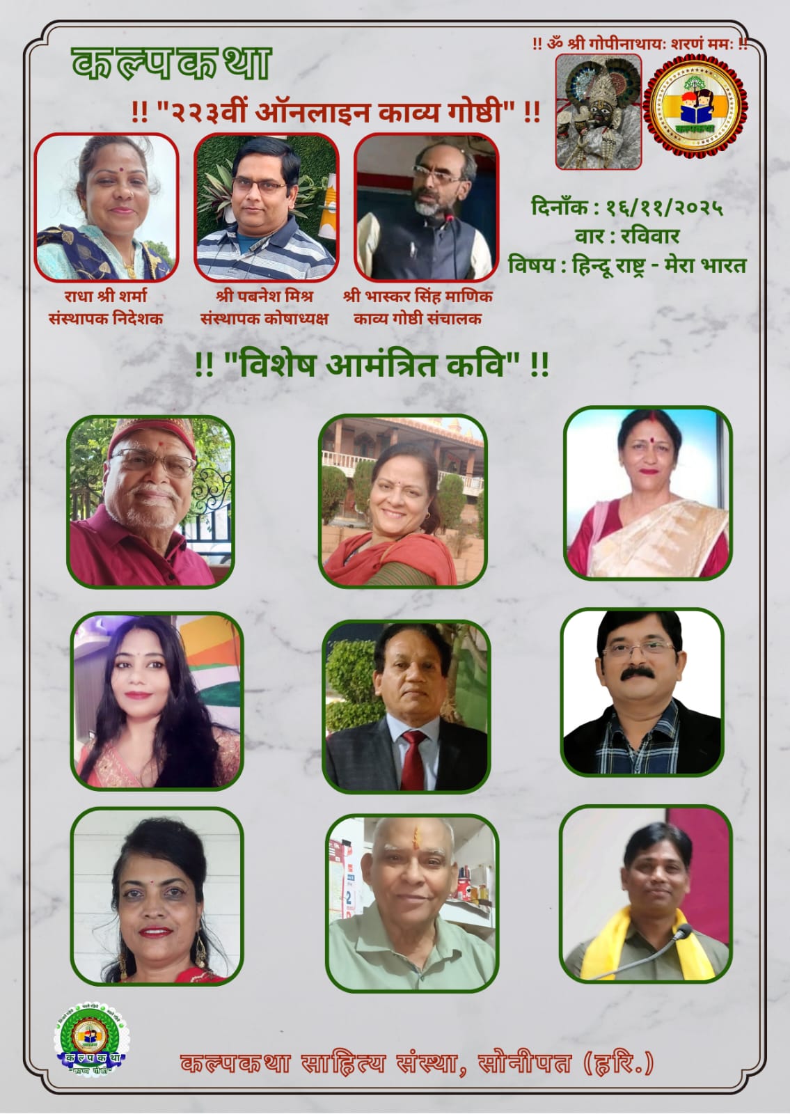 सोनीपत (हरियाणा)। प्रभु श्री राधा गोपीनाथ जी महाराज की कृपा से संचालित एवं सद साहित्य हेतु कृत संकल्पित कल्पकथा साहित्य संस्था परिवार की २२३वीं साप्ताहिक काव्य गोष्ठी आयोजित की गई। इसमें दिल्ली लाल किला के पास बीते दिनों हुए कार बम विस्फोट के कायराना आतंकी हमले पर जनमानस के आक्रोश के स्वर जमकर सुनाई दिए।