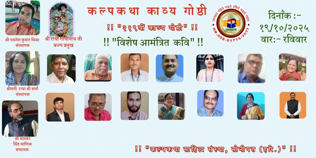सदसाहित्य हेतु कृत संकल्पित कल्पकथा साहित्य संस्था परिवार द्वारा २१९वीं दीपावली पर्व विशेष साप्ताहिक काव्य गोष्ठी आभासी रूप से आयोजित की गई। इसमें सृजनकारों ने शब्दों को दीप और भावनाओं को ज्योति बनाकर संध्या को खूब शोभायमान किया।