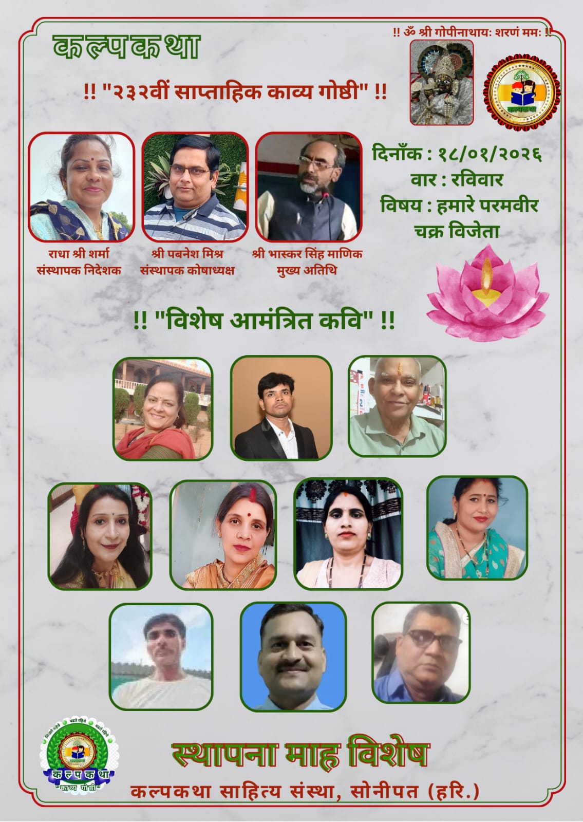 कल्पकथा साहित्य संस्था परिवार द्वारा २३२वीं साप्ताहिक काव्य गोष्ठी राष्ट्रचेतना से परिपूर्ण साहित्यिक आयोजन के रूप में की गई। यह