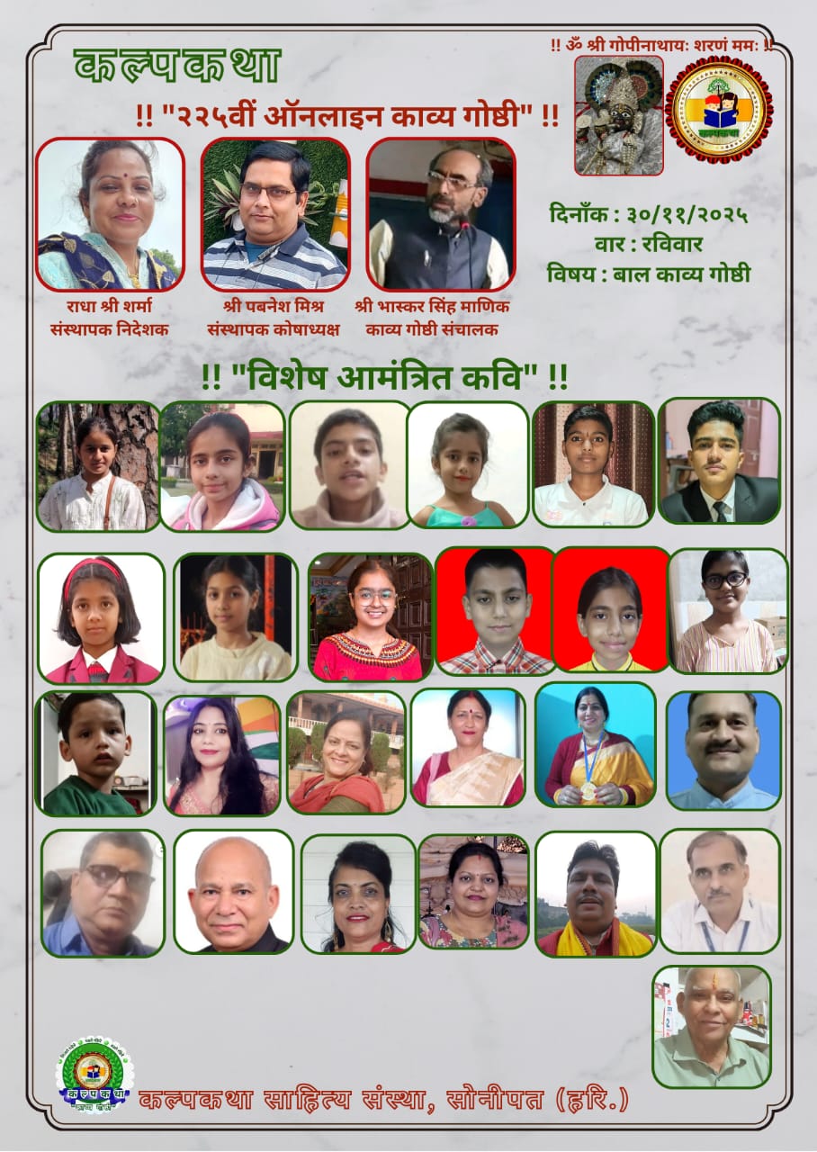 हिन्दी भाषा एवं सद साहित्य हेतु कृत संकल्पित कल्पकथा साहित्य संस्था परिवार ने २२५ वीं आभासी काव्य गोष्ठी में बाल कवियों को प्रस्तुति का अवसर दिया। इन कवियों की उर्वर कल्पना से गोष्ठी जोरदार तरीके से सुरभित होती रही।