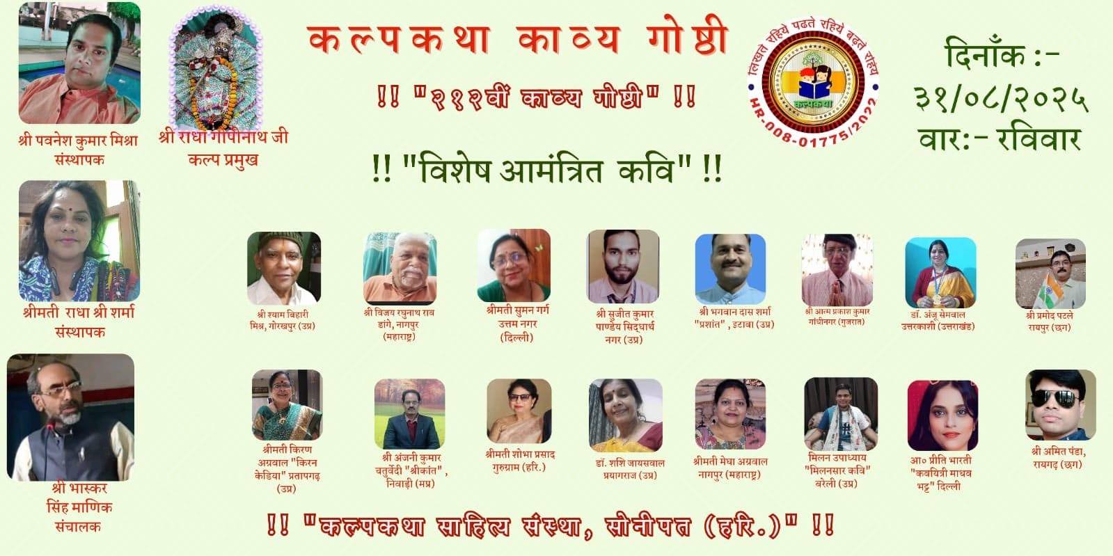 राधाष्टमी पर्व पर कल्पकथा परिवार की २१२वीं काव्यगोष्ठी आयोजित की गई। प्रभु श्री राधा गोपीनाथ जी की कृपा से यह निरंतर ‘राधे-राधे’ जय घोष से ऊर्जान्वित होती रही।