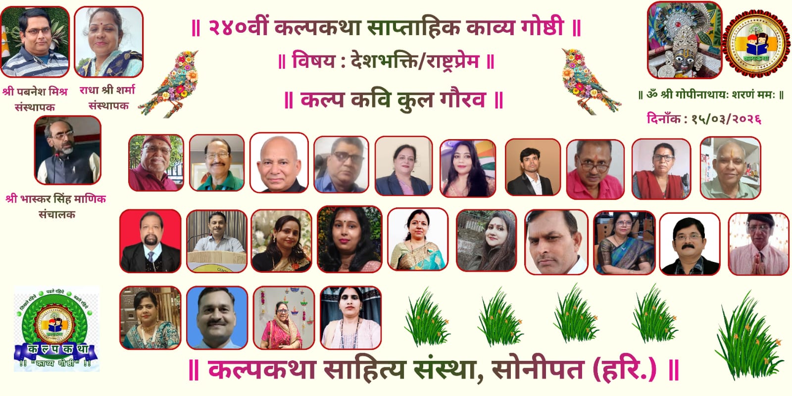 हिन्दी भाषा, सनातन संस्कृति एवं सद साहित्य हेतु कृत संकल्पित कल्पकथा साहित्य संस्था परिवार ने भारत माता के प्रति समर्पित भावनाओं से ओत-प्रोत २४०वीं साप्ताहिक काव्य गोष्ठी का आयोजन ‘देशभक्ति- राष्ट्रप्रेम’ विषय पर अत्यंत गरिमामय वातावरण में किया। इसमें विविध प्रांतों से जुड़े प्रबुद्ध साहित्यकारों ने अपनी ओजस्वी, भावपूर्ण और राष्ट्रनिष्ठ रचनाओं से भारतभूमि के प्रति अपनी श्रद्धा, समर्पण और गौरव का सशक्त प्रकटीकरण किया।
