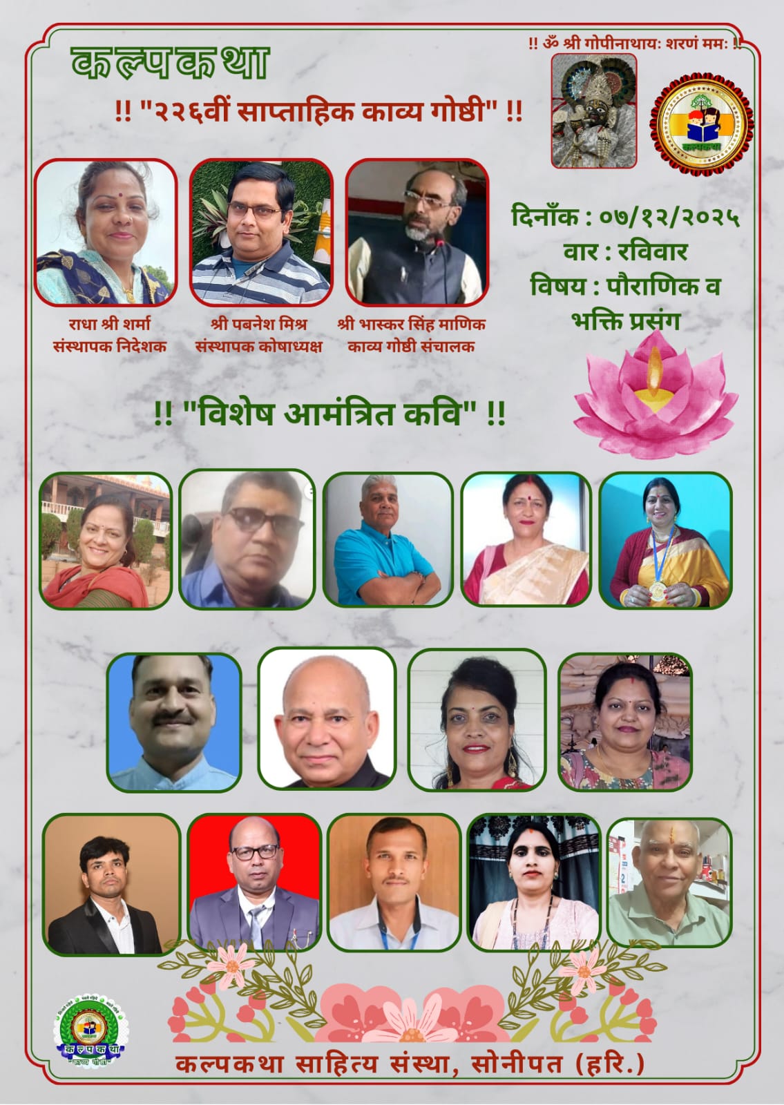 राष्ट्र प्रथम, हिन्दी भाषा, सनातन संस्कृति एवं सद साहित्य की सेवा हेतु कृत संकल्पित कल्पकथा साहित्य संस्था परिवार की साप्ताहिक आभासी काव्य गोष्ठी पौराणिक भक्ति प्रसंगों पर आधारित काव्य रचनाओं से सुवासित होती रही। इसकी अध्यक्षता वाराणसी के प्रबुद्ध साहित्यकार पं. अवधेश प्रसाद मिश्र ‘मधुप’ ने की। विद्वान कवयित्री मेघा अग्रवाल (नागपुर) का मुख्यातिथ्य रहा।